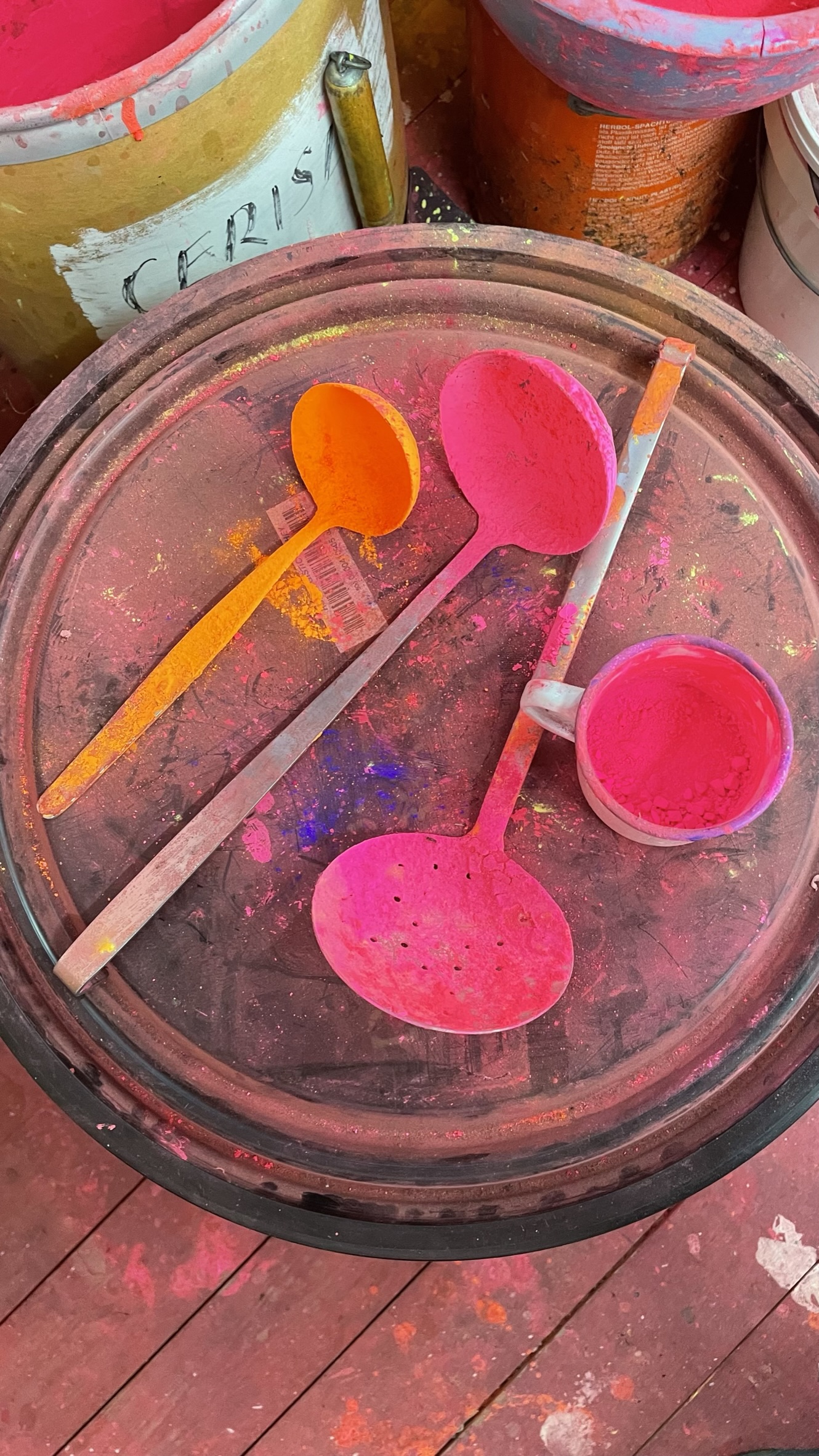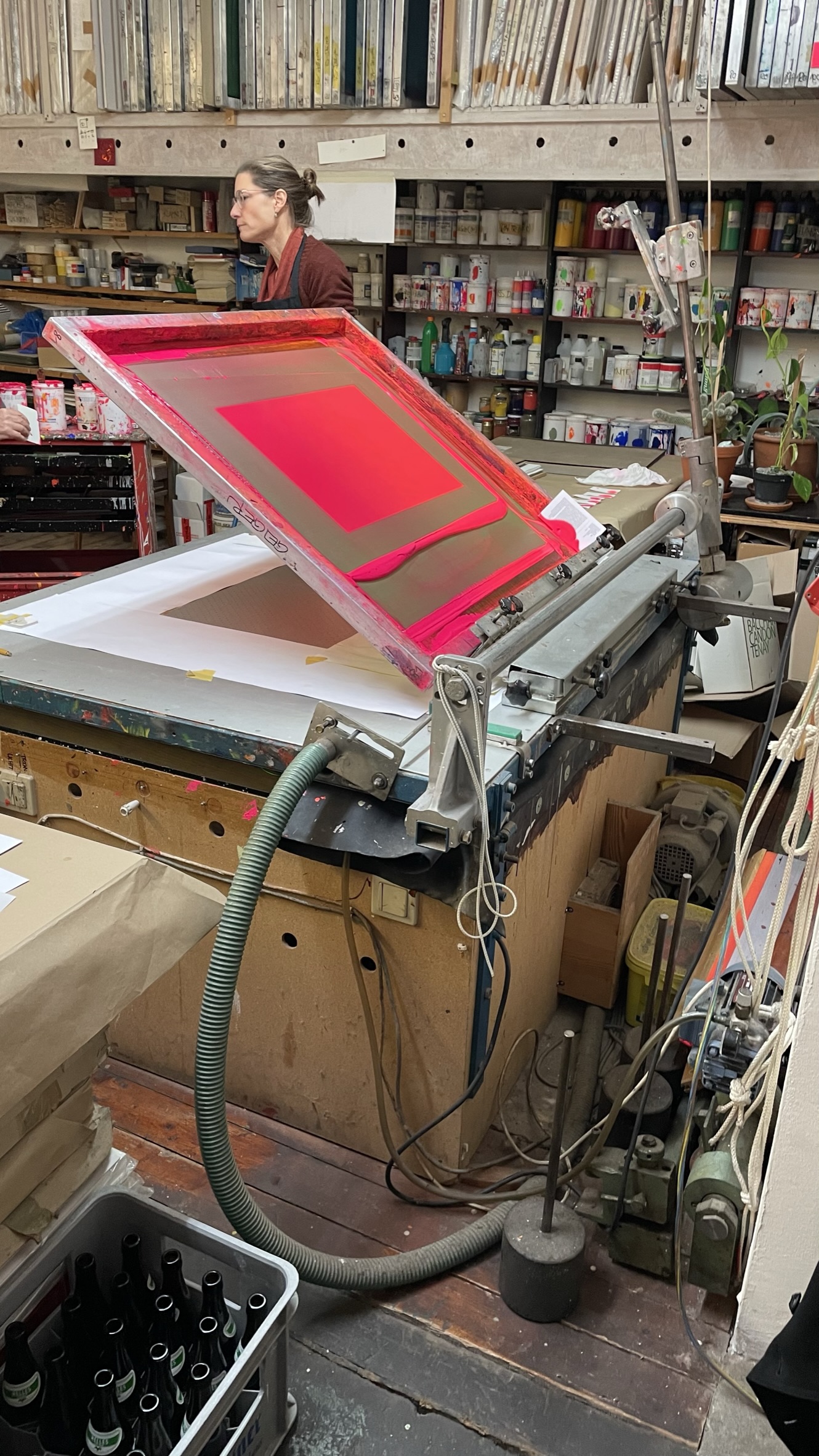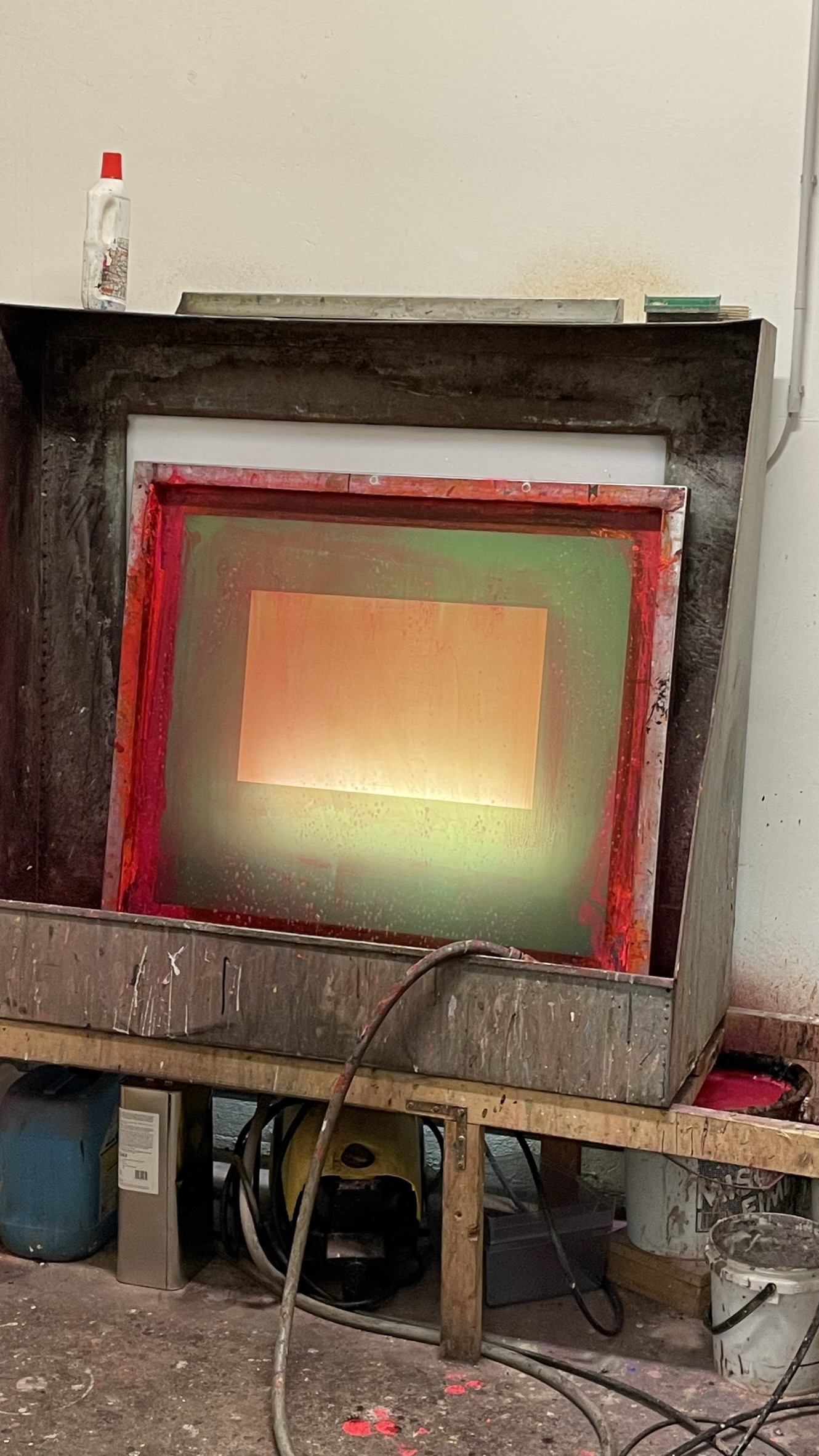 Das Archiv Geiger bietet Siebdruckworkshops an. Beim Workshop kann man mit Hilfe eines erfahrenen Druckers, der noch eng mit Rupprecht Geiger zusammengearbeitet hat mit den original Tageslichtfarben seinen eigen abstrakten „Geiger“ drucken und wir sind damit sehr glücklich.